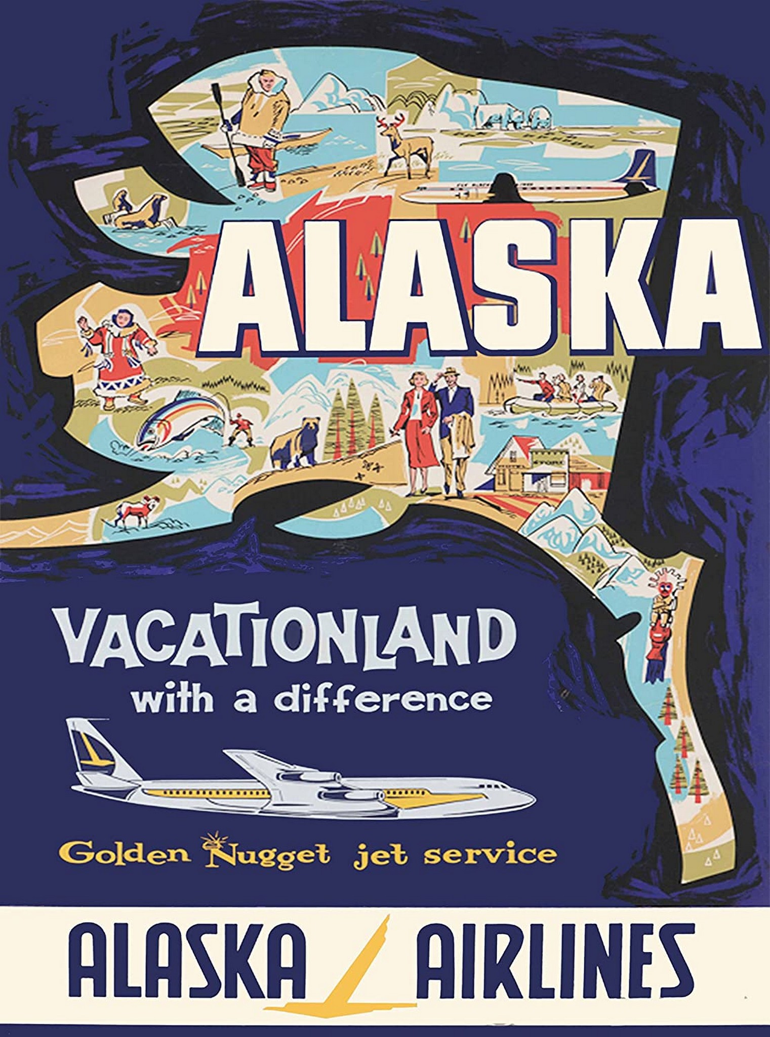 1959 Alaska. Vacationland with a difference. Golden Nugget jet service. Alaska Airlines