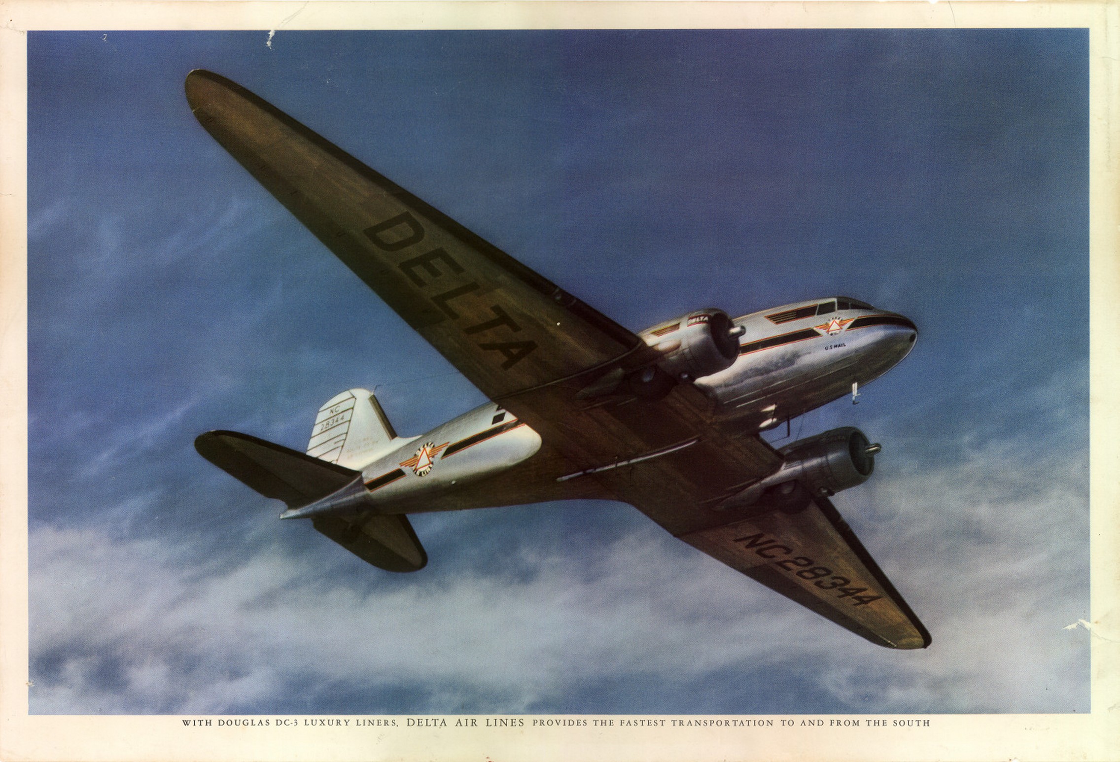 Delta Air Lines. With Douglas DC-3 luxury liners, Delta Air Lines provides the fastest transportation to and from the South., poster, Date Unknown; (digital.library.unt.edu/ark:/67531/metadc459/m1/1/: accessed March 18, 2017), University of North Texas Libraries, Digital Library, digital.library.unt.edu; crediting UNT Libraries Government Documents Department.