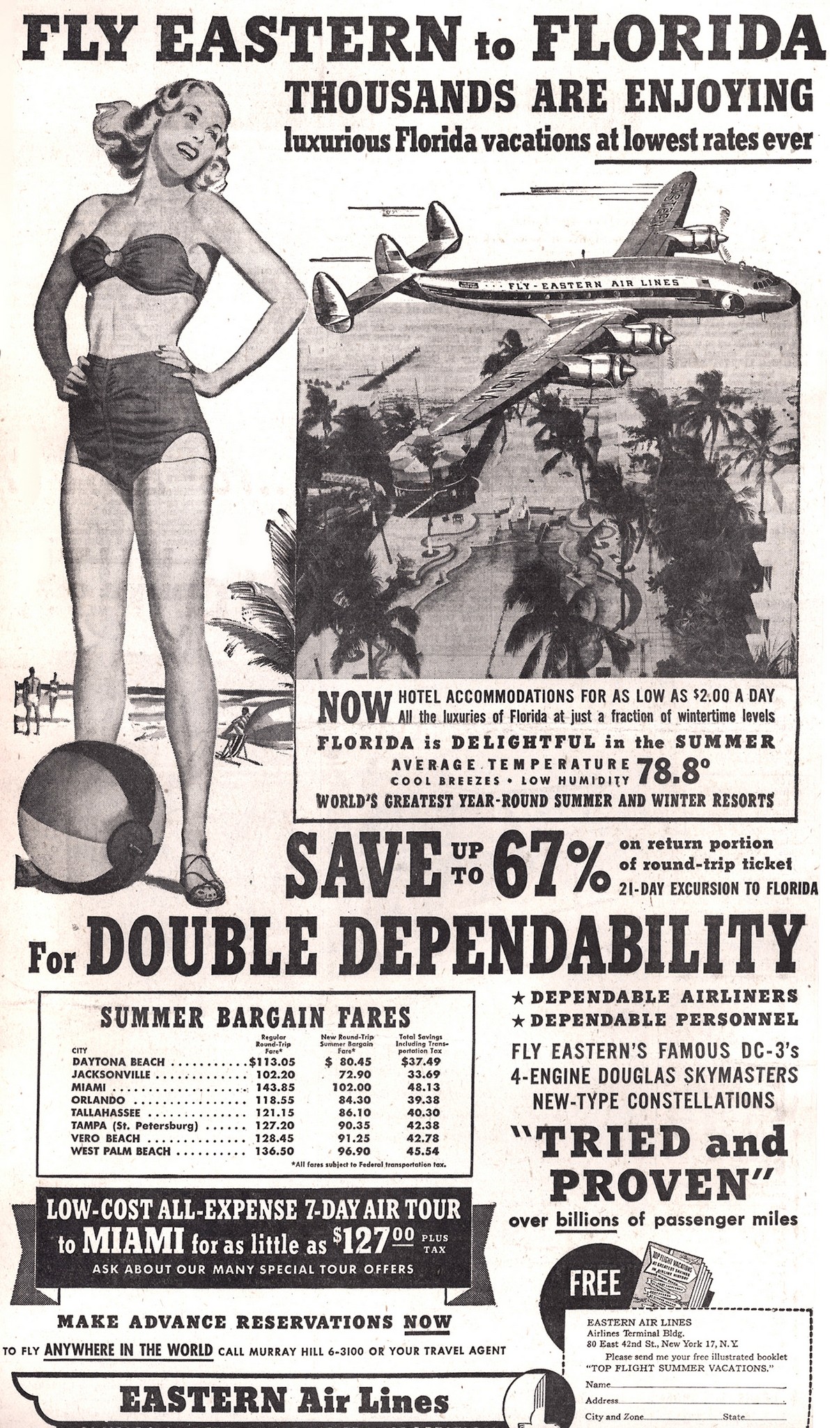 1949 Fly Eastern to Florida. Thousands Are Enjoying luxurious Florida vacations at lowest rates ever