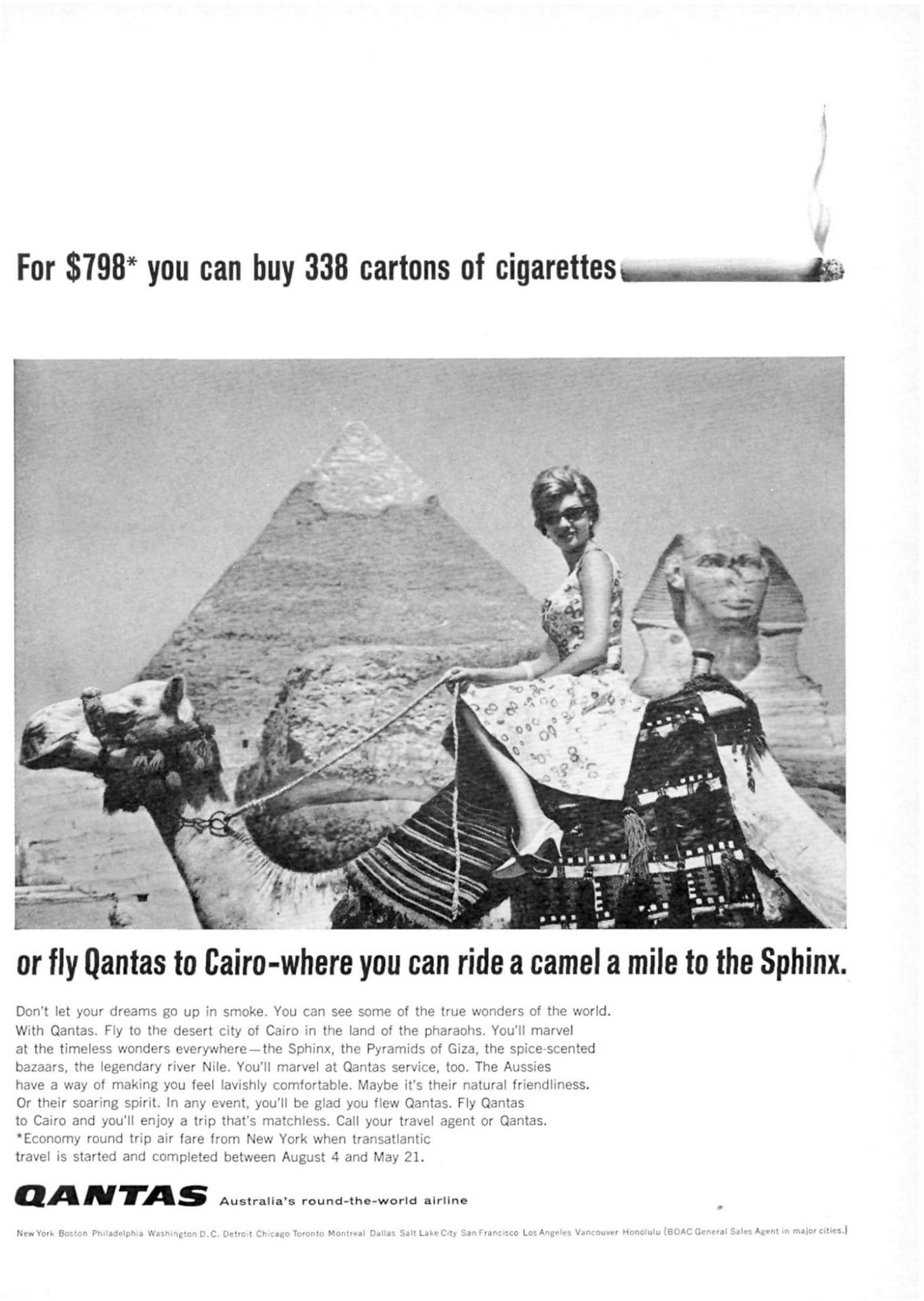 1965 For $798 you can buy 338 cartons of cigarettes or fly Qantas to Cairo