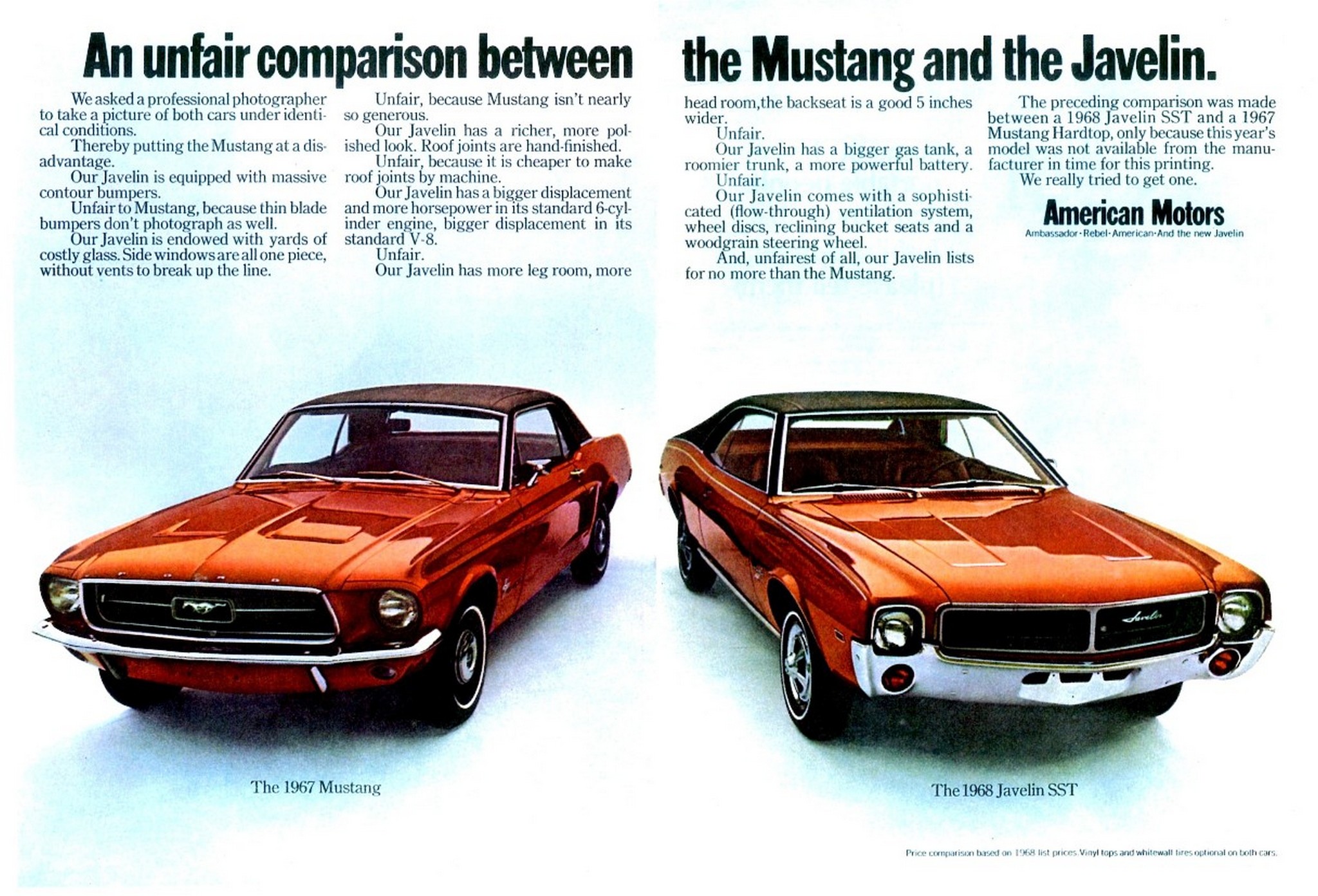 1968 AMC Javelin SST vs. 1967 Ford Mustang. An unfair comparison between the Mustang and the Javelin