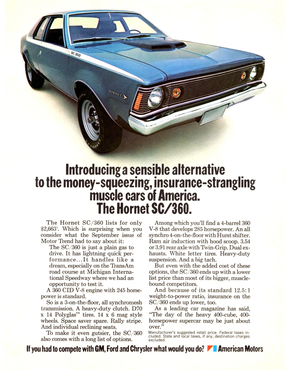 1971 AMC Hornet SC-360. Introducing a sensible alternative to money-squeezing, insurance-strangling muscle cars of America