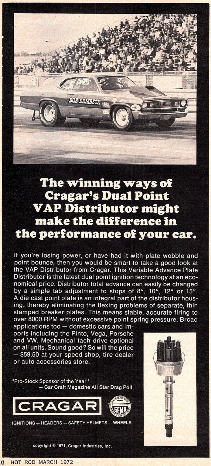 1972 The winning ways of Cragar’s Dual Point VAP Distributor might make the difference in the performance of your car