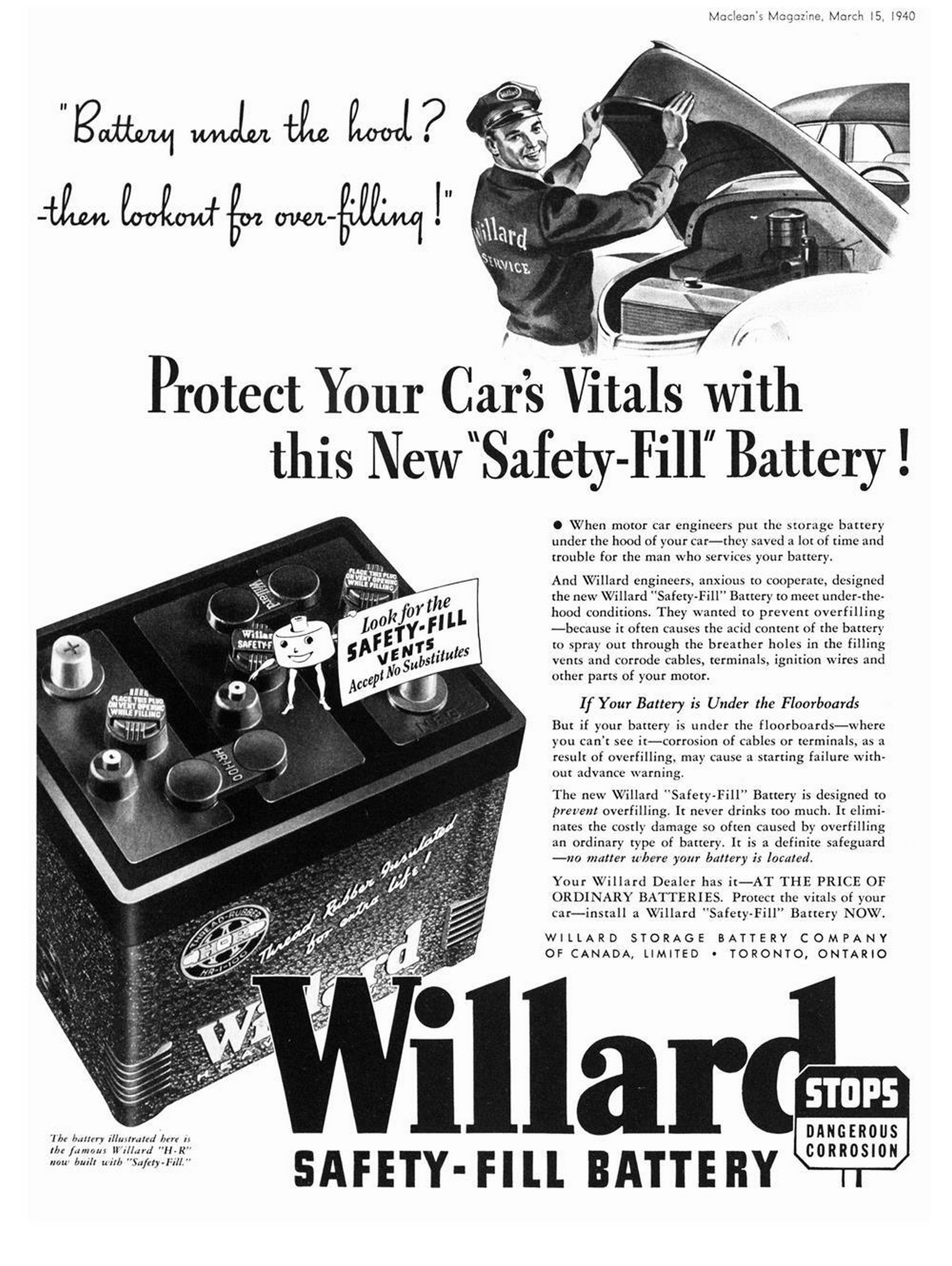1940 Protect Your Car's Vitals with this New 'Safety-Fill' Battery! Willard