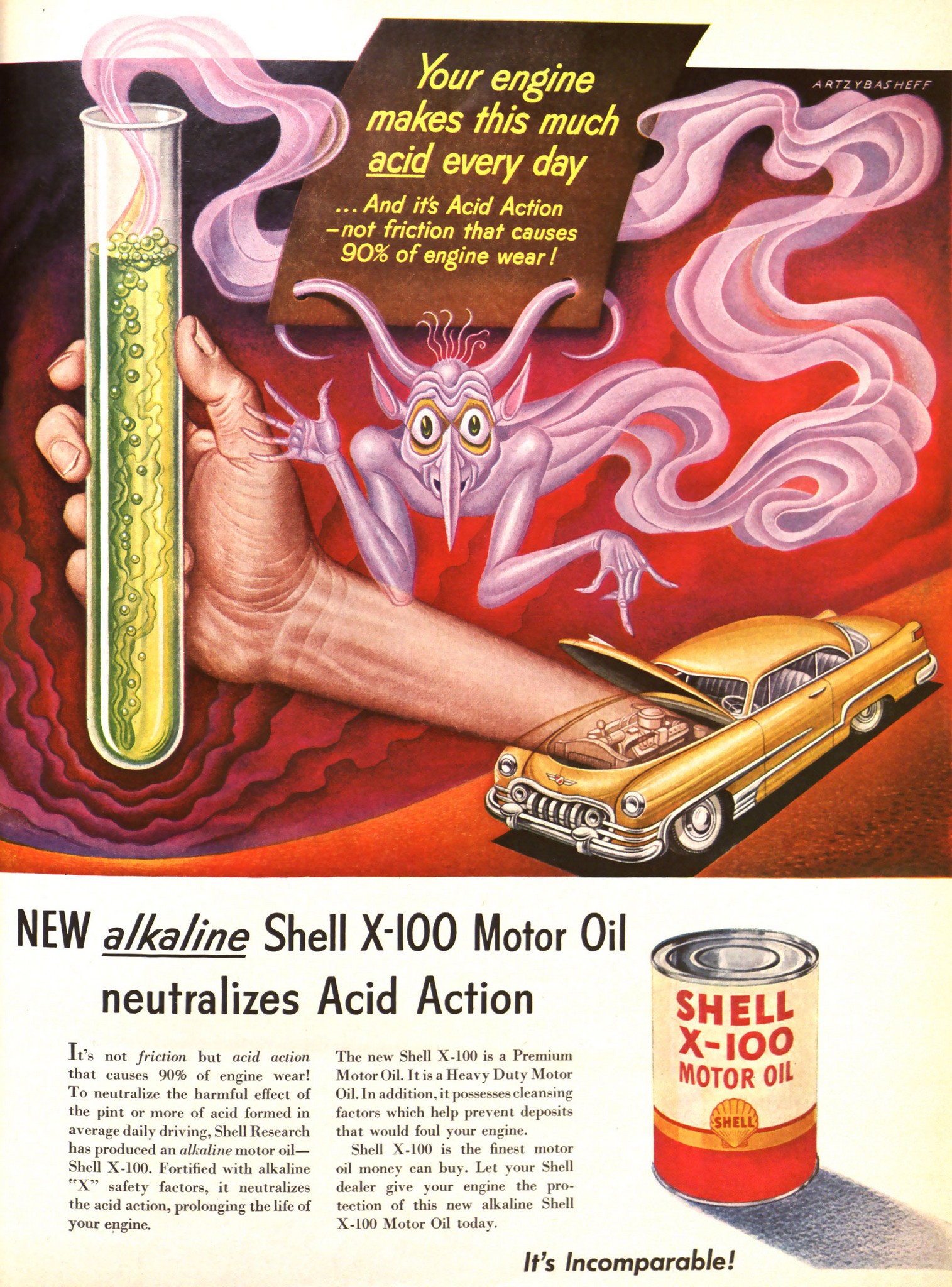 1951 New alkaline Shell X-100 Motor Oil neutralizes Acid Action