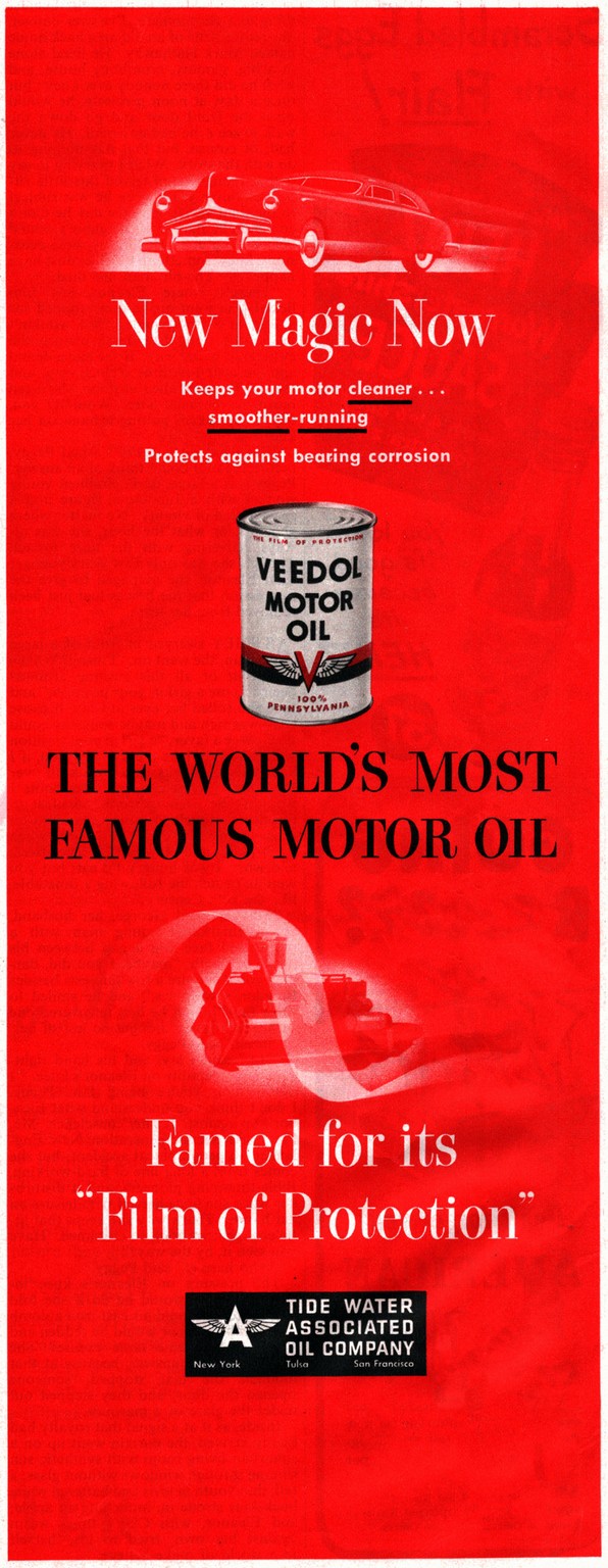 1948 New Magic Now. The World’s Most Famous Motor Oil. Famed for its ‘Film of Protection’ Veedol
