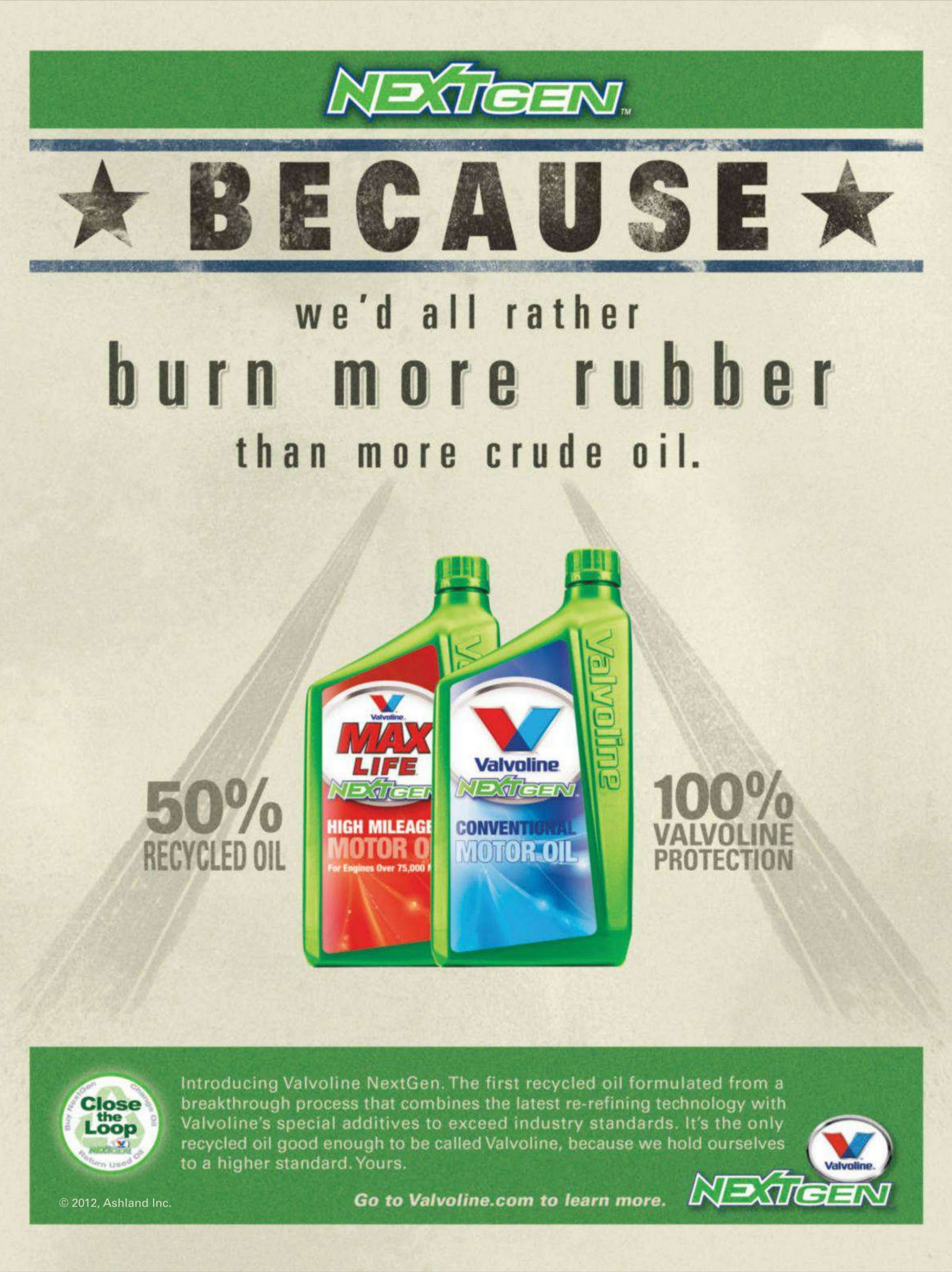 2012 Nextgen Because we'd all rather burn more rubber than more crude oil. Valvoline