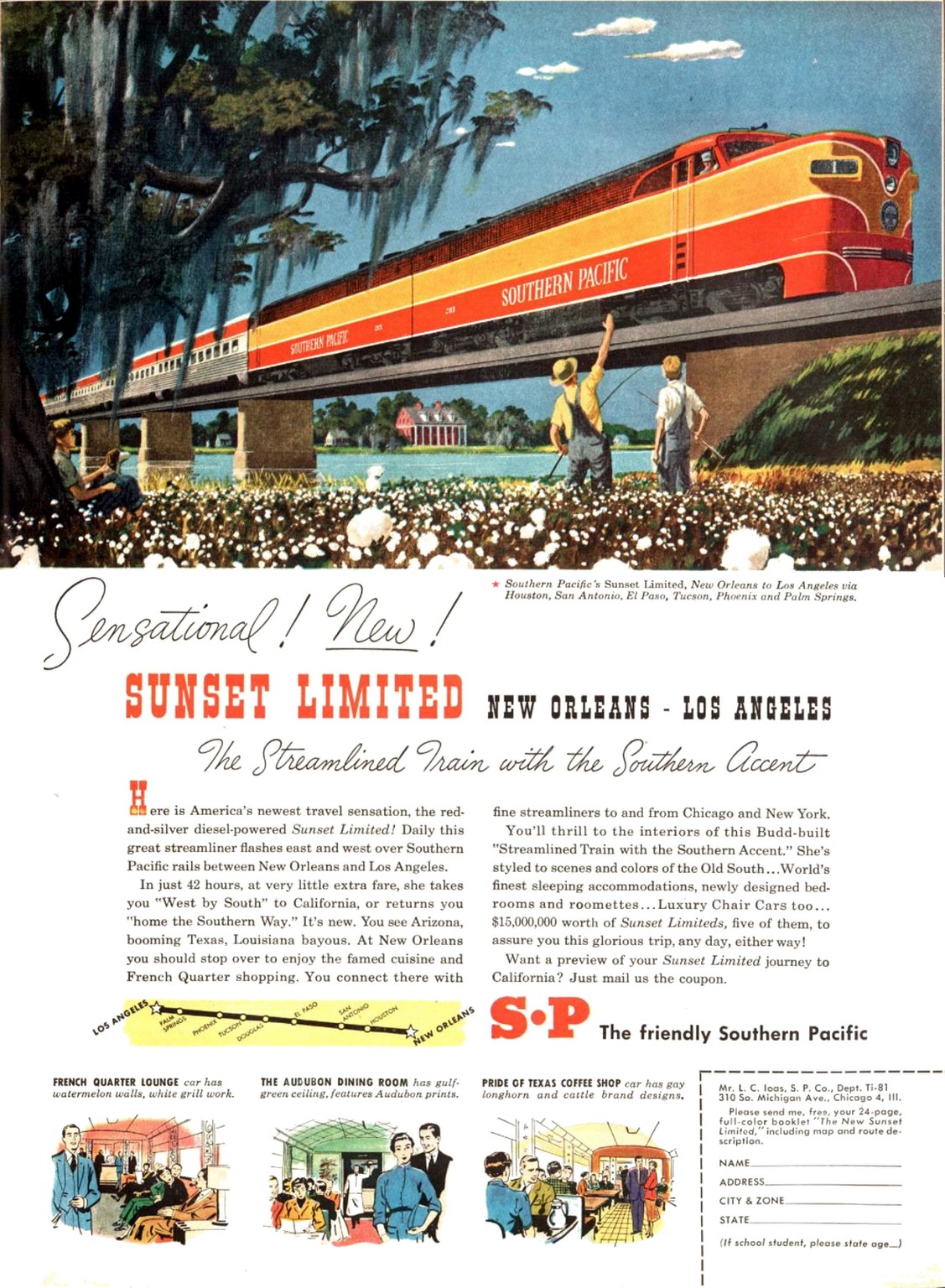 1950 Sensational! New! Sunset Limited New Orleans – Los Angeles. S-P The friendly Southern Pacific