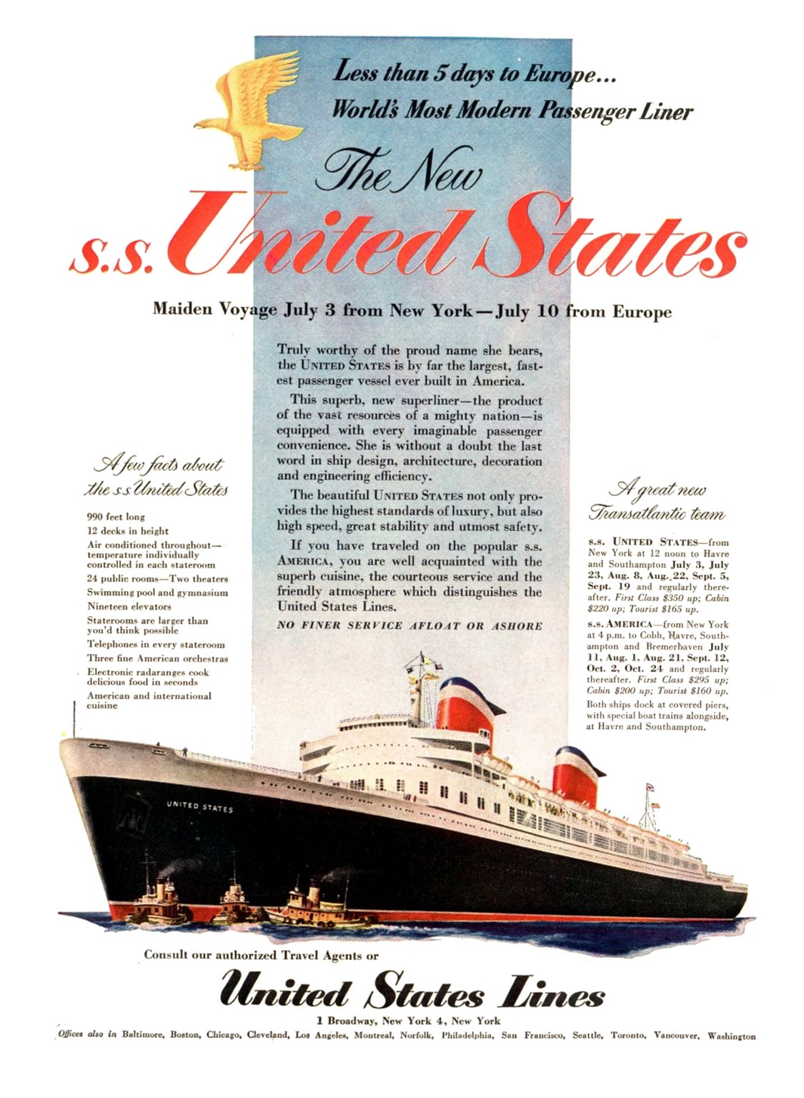 1952 Less than 5 days to Europe… World Most Modern Passenger Liner. The New s.s. United States. United States Lines