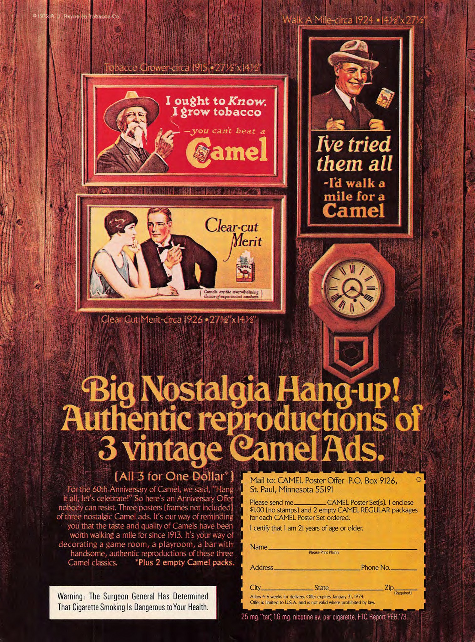 1973 Big Nostalgia Hang-up! Authentic reproductions of 3 vintage Camel Ads