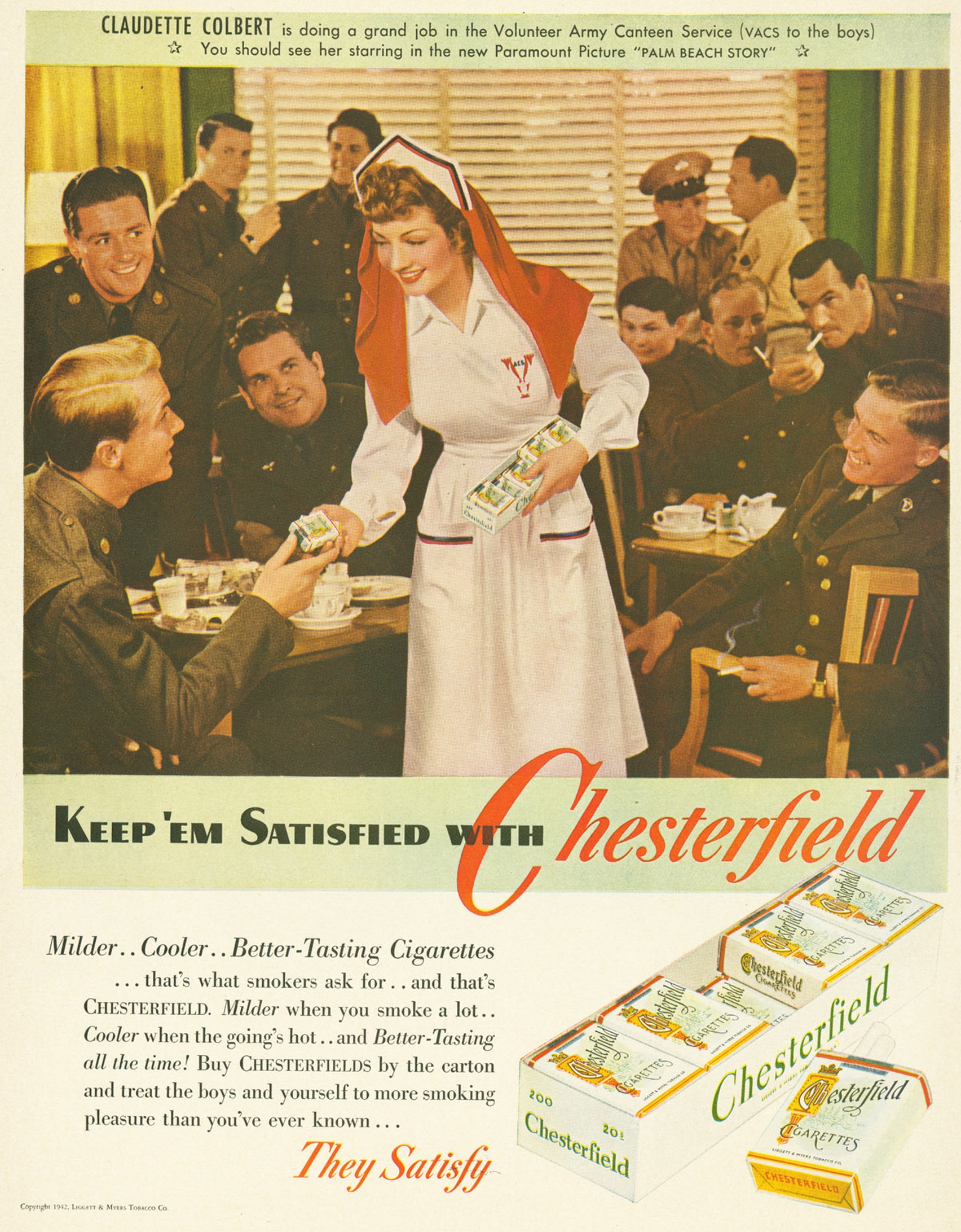 1942 Claudette Colbert is doing a grand job in the Volunteer Army Canteen Service. Chesterfield