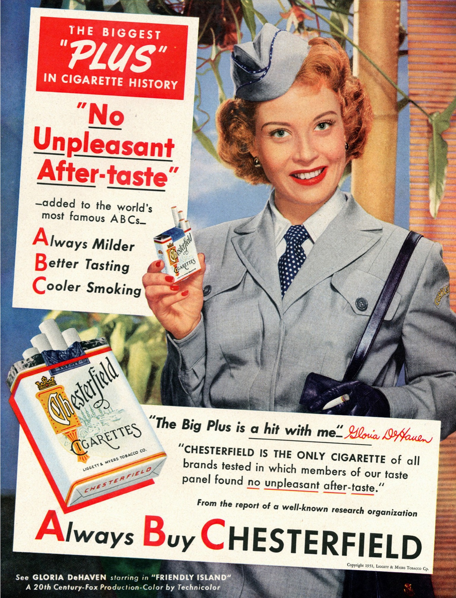 1952 Gloria DeHaven with Chesterfield. 'No Unpleasant After-taste'