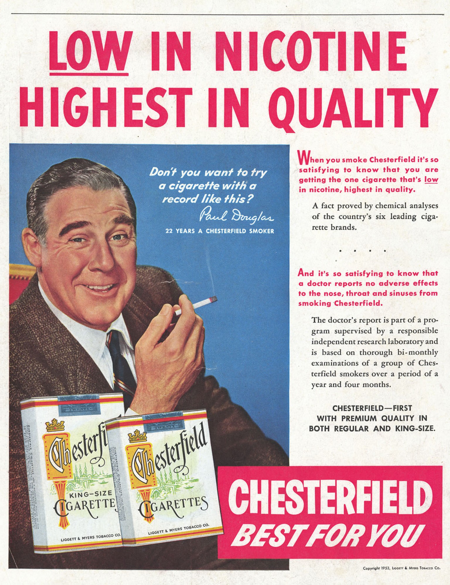 1953 Low In Nicotine Highest In Quality. Chesterfield Best For You. Paul Douglas