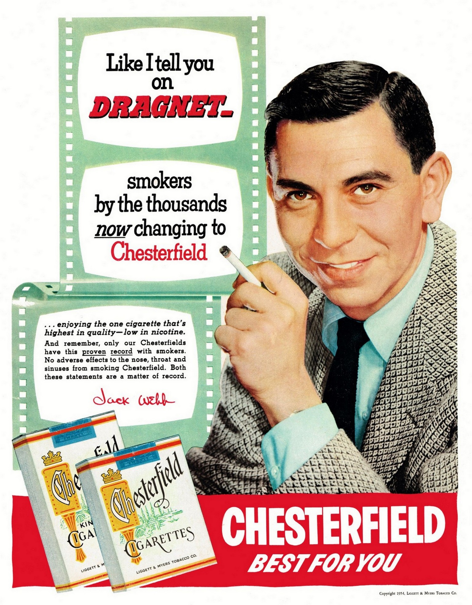 1954 Like I tell you on Dragnet – smokers by the thousands now changing to Chesterfield. Jack Webb