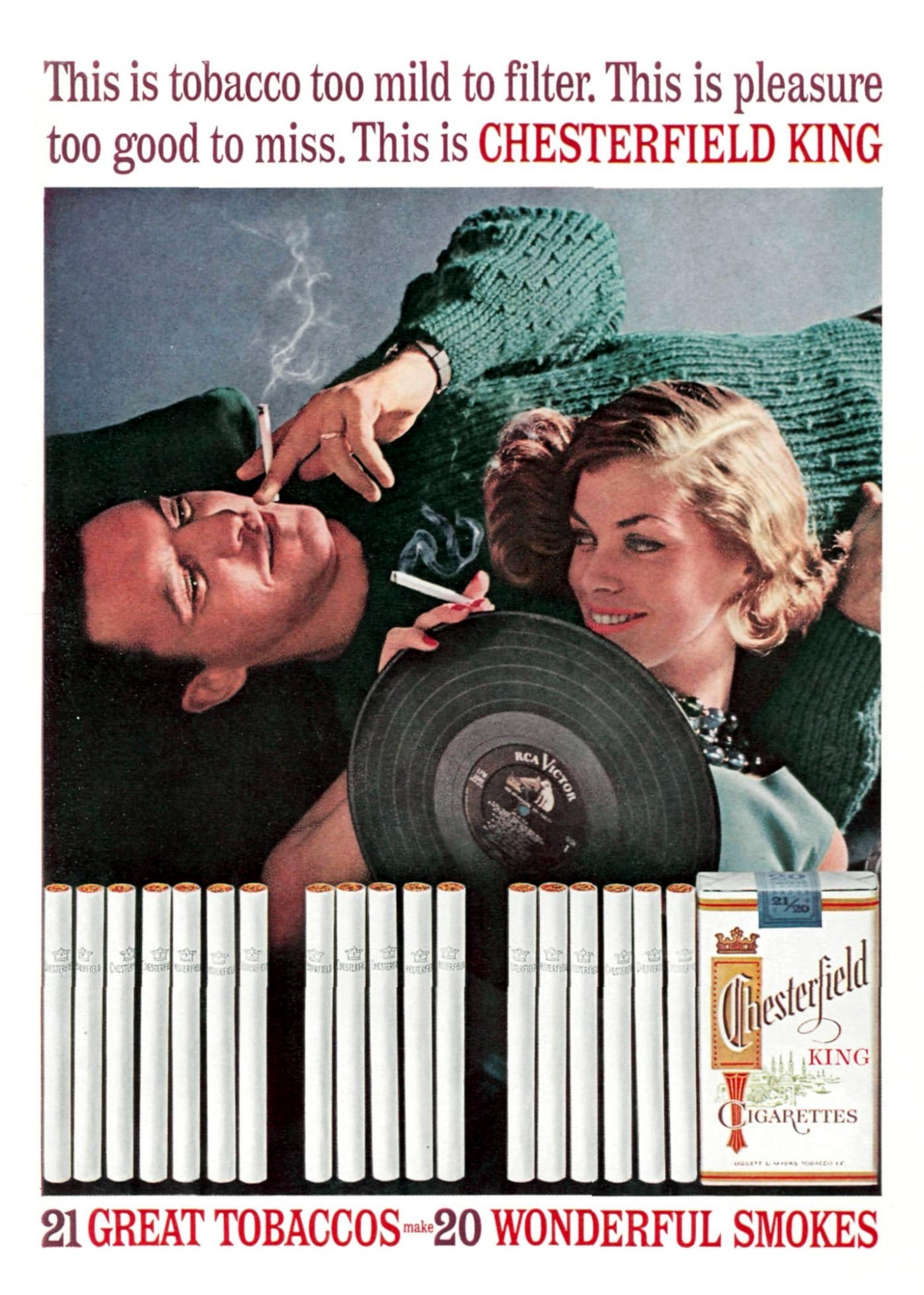 1962 This is tobacco too mild to filter. This is pleasure too good to miss. This is Chesterfield King