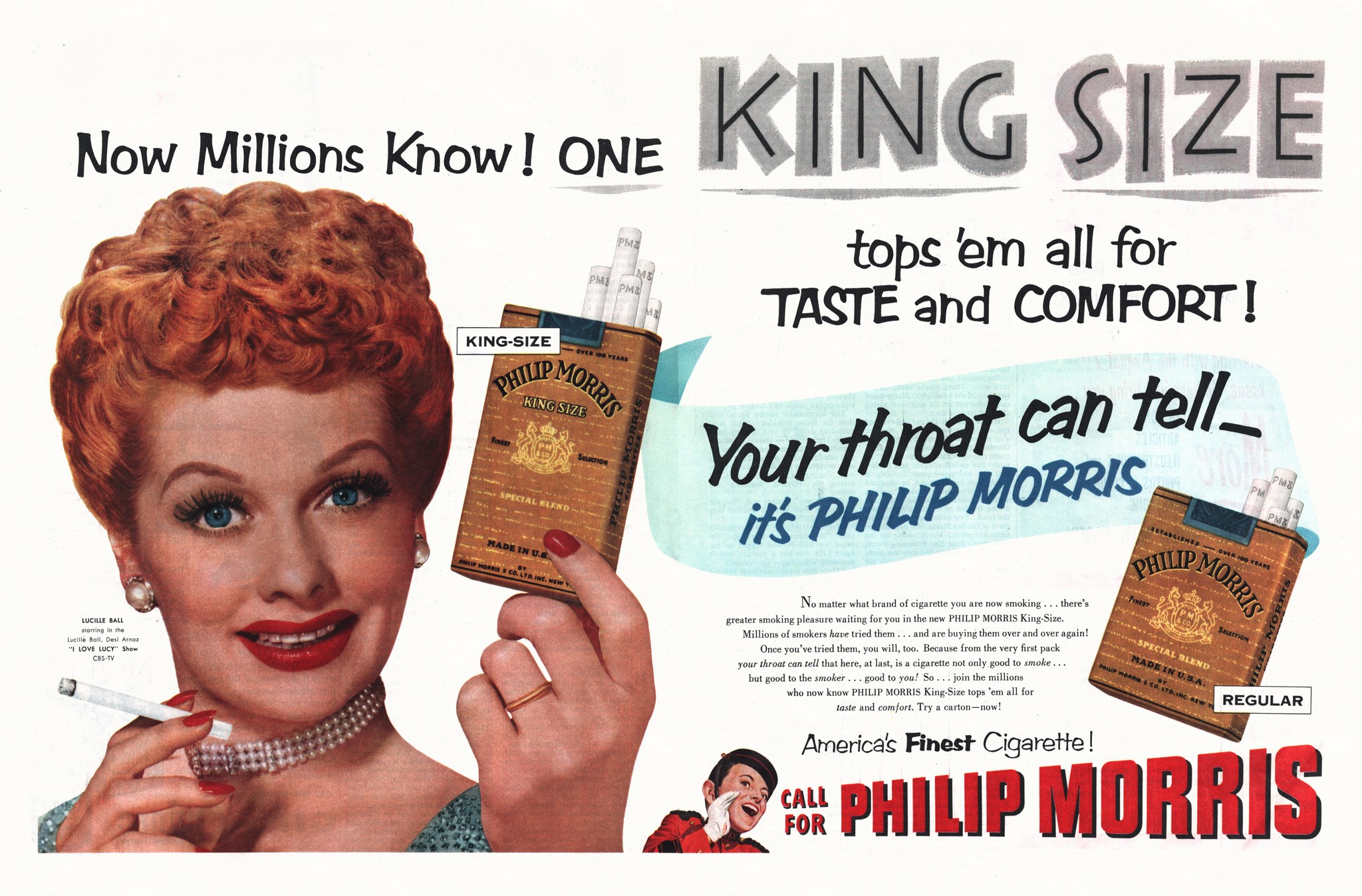 1953 Now Millions Know! One King Size tops ’em all for Taste and Comfort! Philip Morris