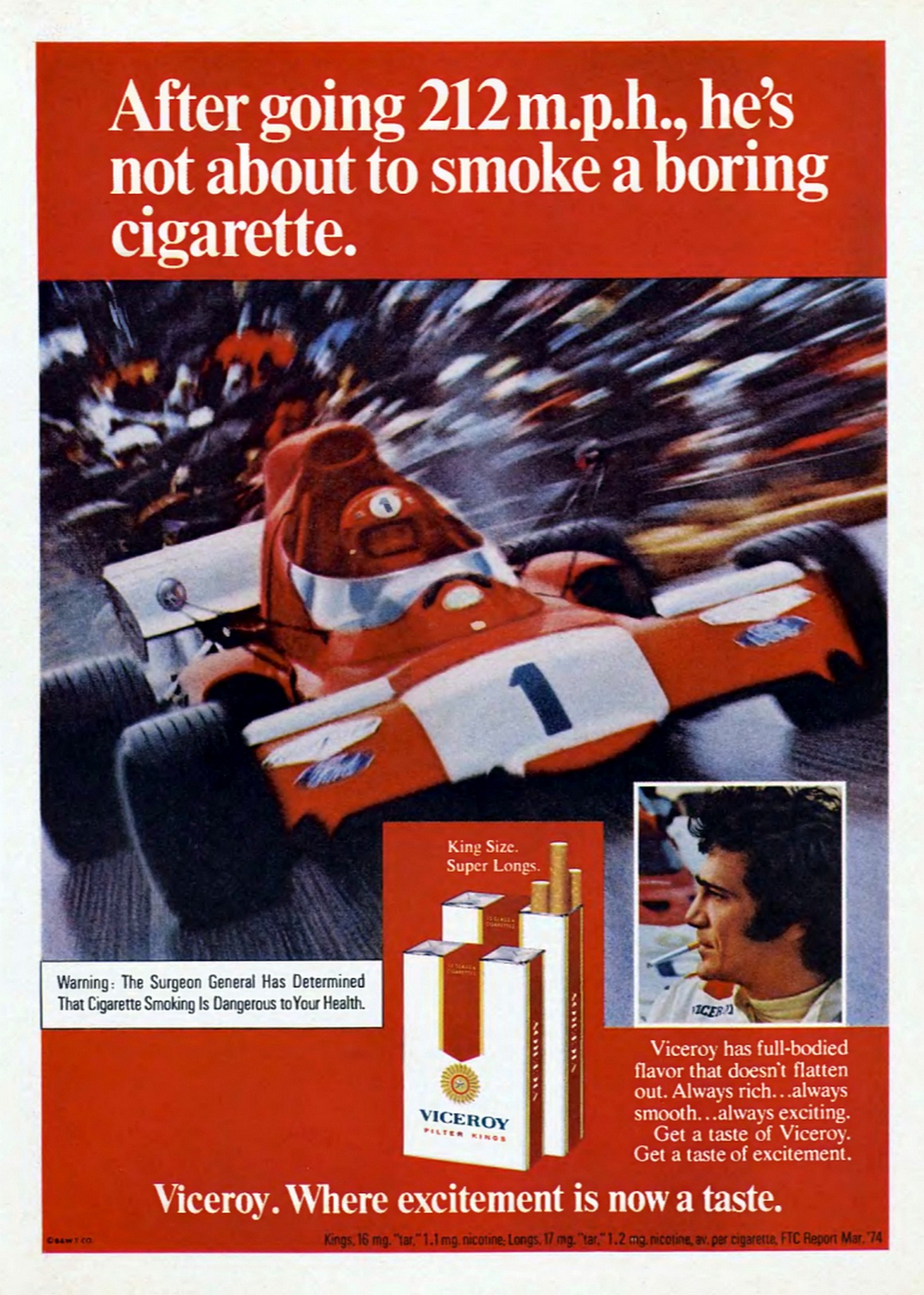 1974 After going 212 m.p.h., he’s not about to smoke a boring cigarette. Viceroy. Where excitement is now a taste