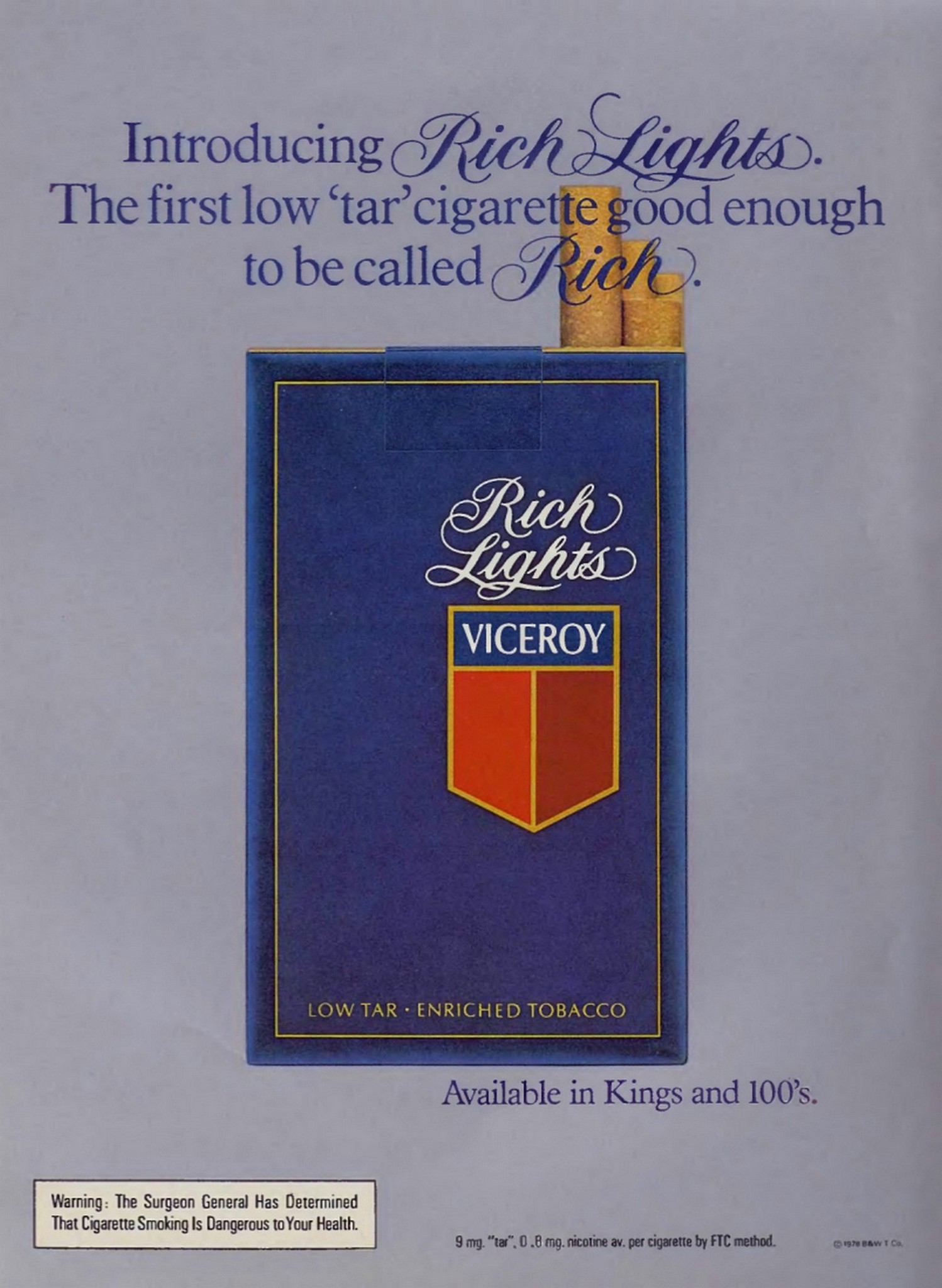 1978 Introducing Right Lights. The first low ‘tar’ cigarette good enough to be called Rich. Viceroy