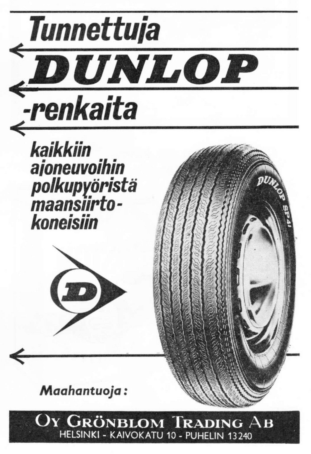 1965 Tunnettuja Dunlop – renkaita kaikkin ajoneuvoihin, polkupyöriin, maansiirtokoneisiin