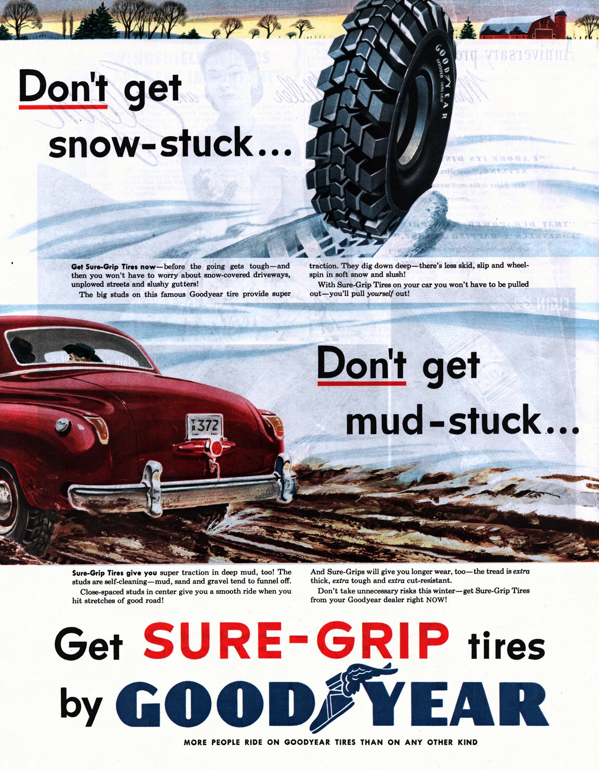 1949 Don't get snow-stuck... Don't get mud-stuck... Get Sure-Grip tires by GoodYear