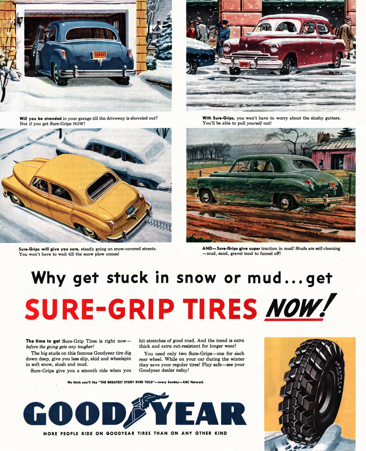 1949 Why get stuck in snow or mud… get Sure-Grip Tires Now! GoodYear